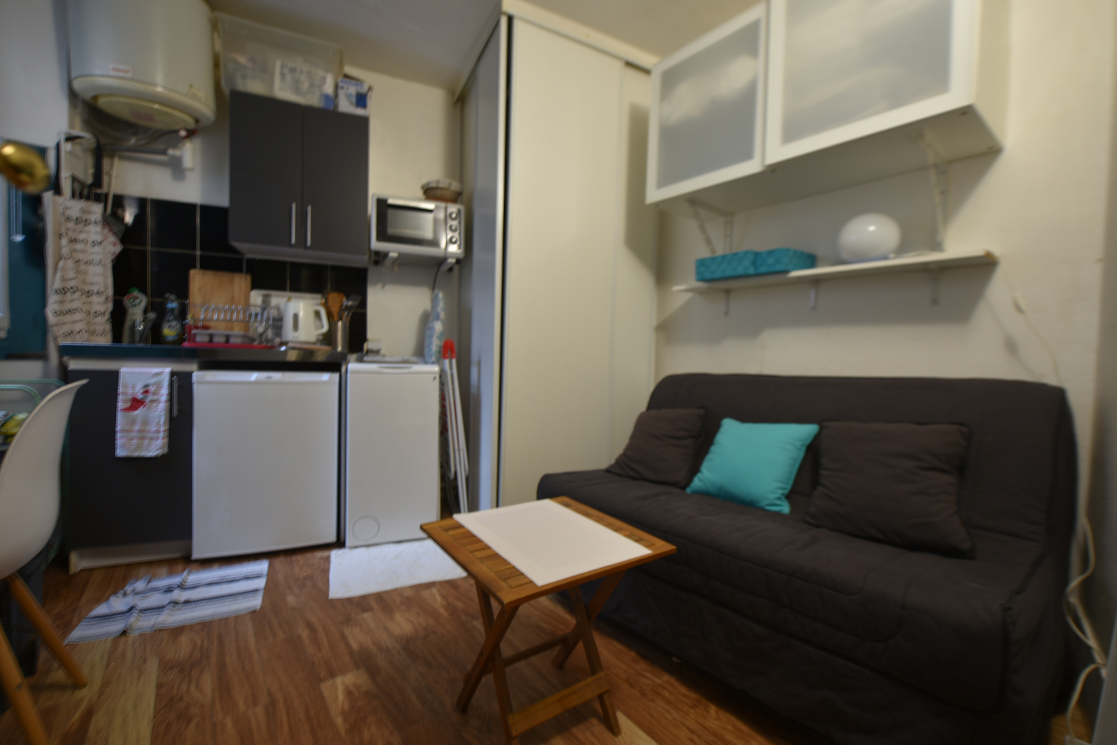 M° Sablons. Dans un bel immeuble Pierre de taille de standing, une chambre meublée d'une superficie de 9.04m² situé au 6ème et dernier étage sans ascensuer par escalier de service comprenant une pièce principale un coin cuisine équipée (réfrigérateur, plaques, lave-linge), une douche. Rangements.