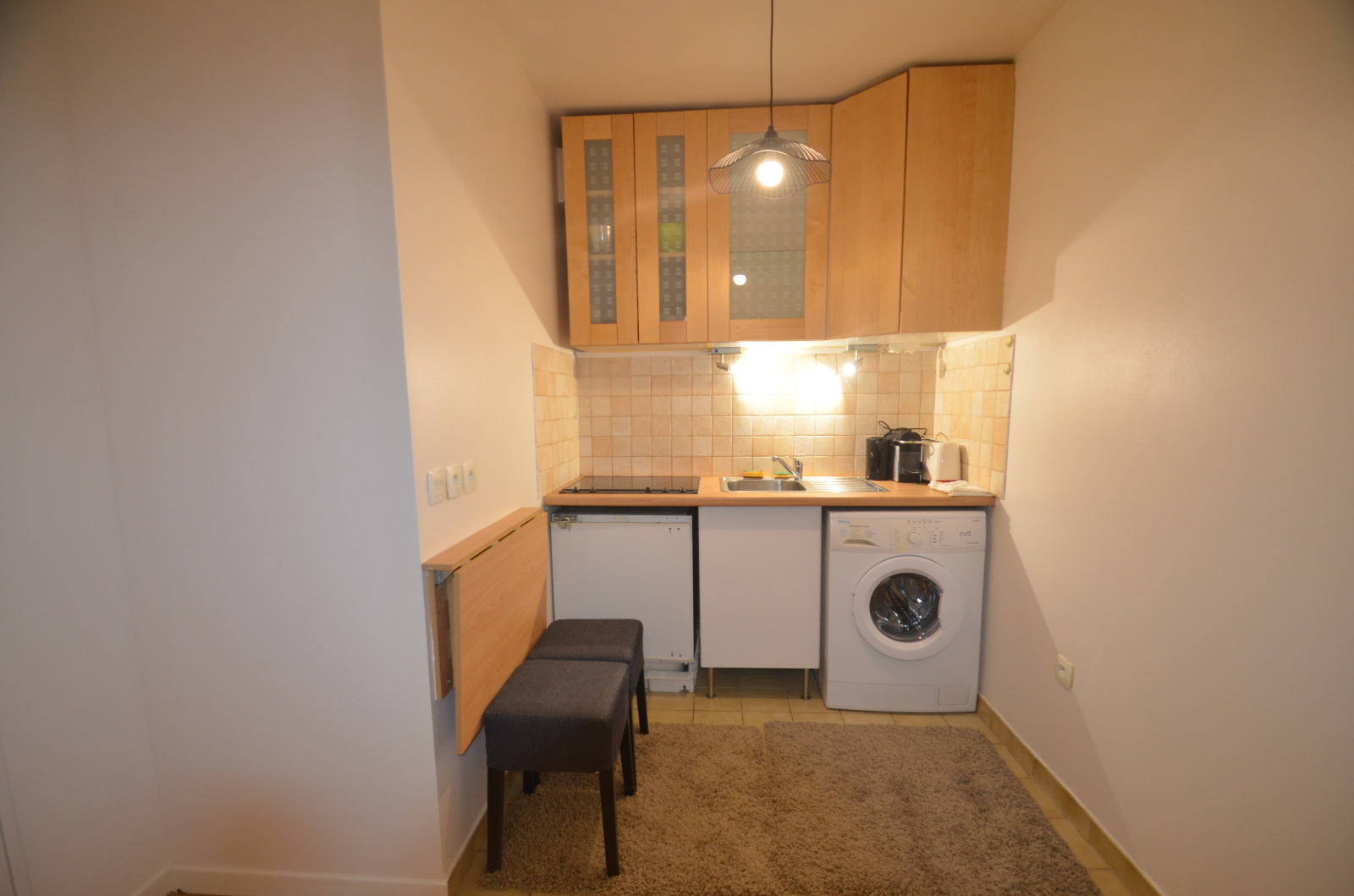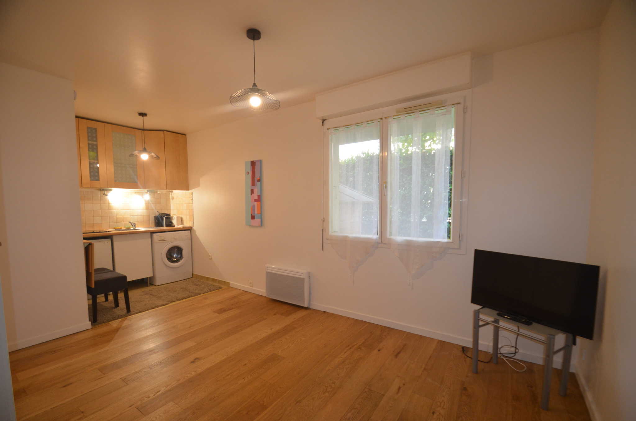 Rue des Bleuets. A proximité de la Défense. Dans un immeuble récent (1996) au RDC sur jardin, un studio meublé d'une superfiie de 23m² comprenant une entrée avec placard, une pièce principale, une cuisine américaine équipée, une SB avec WC. Parquet au sol. Chauffage individuel électrique. Sur jardin. Calme. TB Etat. Parking